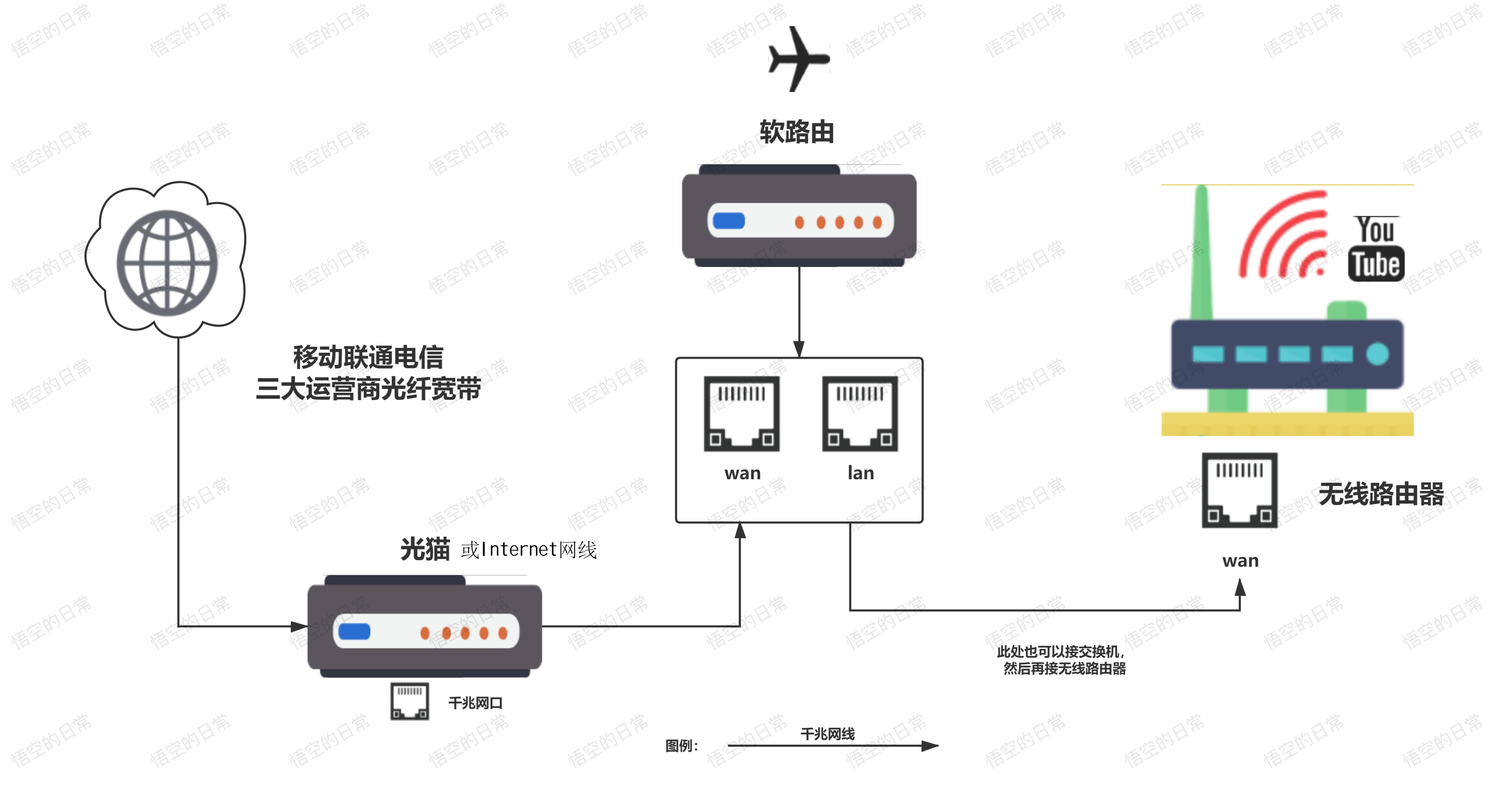 软路由的接法很简单。通常是接在光猫和无线路由器之间,如下图所示